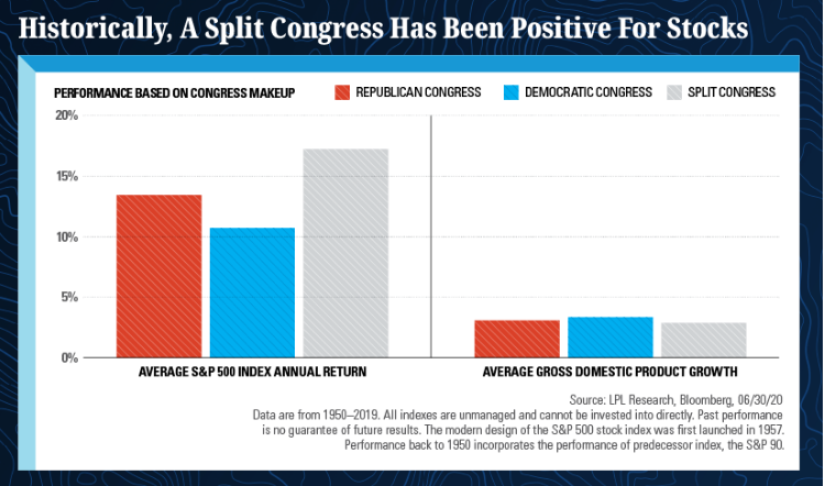When Republicans have controlled both chambers in Washington, DC, on average the S&P 500 has gained 13.4% per year and GDP has grown 3%. When Democrats have controlled both the House of Representatives and the Senate, the economy did a little better, with GDP growth of 3.3%, while the S&P 500 was up 10.7% on average. When we’ve had a split Congress, however, the average S&P 500 gain climbed to 17.2%, while GDP growth averaged 2.8%, again suggesting markets may prefer split power come November.